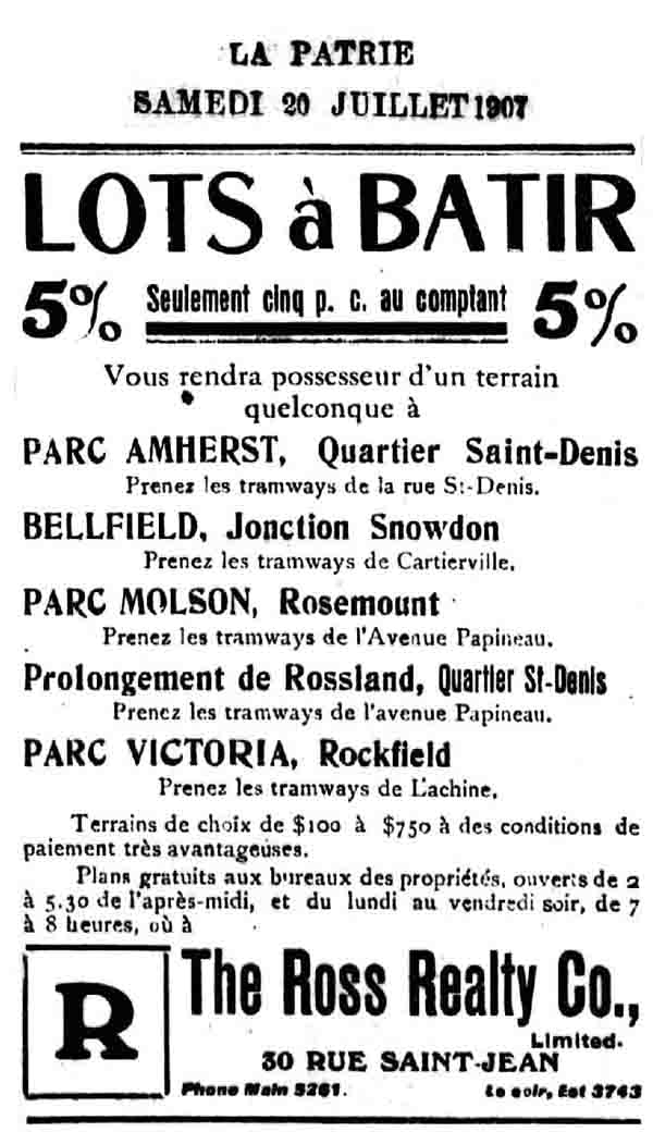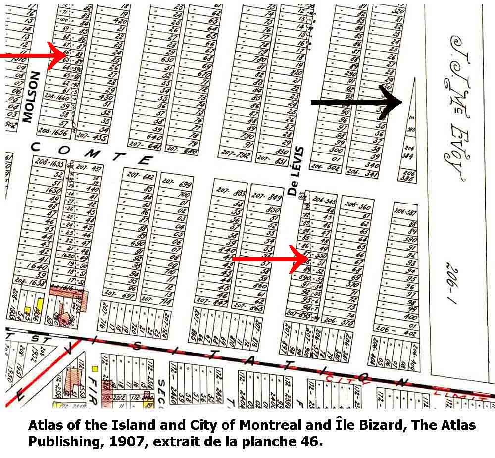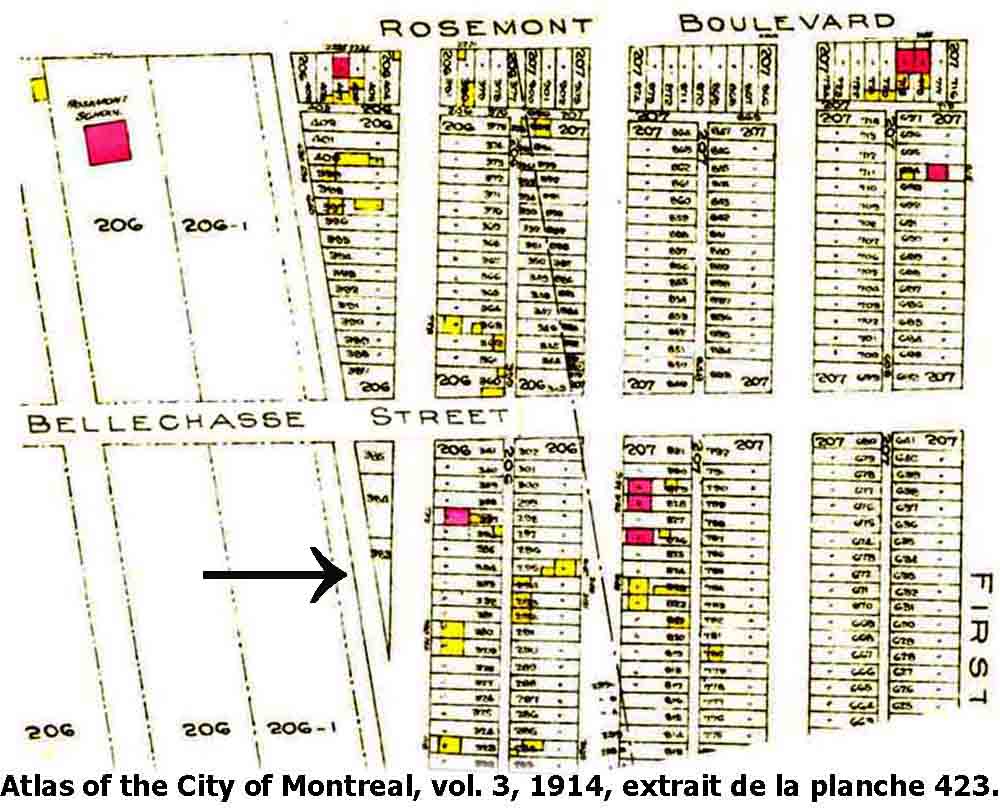 Si on suit les lots bordant cette rue, côté sud, on voit, de gauche à droite, les lots 208-1653, 207-437, 207-682, et plus à droite, les lots 206-343, 206-360 et 206-387. On aura d’abord compris que la numérotation du système cadastral des lots commence par le numéro de la terre d’origine observé sur les figures précédentes (206, 207, 208…). Ensuite, on remarquera que, dans la mesure où l’orientation générale des rues dans ce secteur n’est pas parallèle à celle des terres dont les frontières apparaissent en pointillé (à titre indicatif, voir les deux flèches rouges) En intégrant, par exemple, la terre de Keen à leur domaine foncier, les Molson ont théoriquement évité la formation de lots en pointe de tarte le long de la rue de Lévis (maintenant la 4e avenue) dont les futures maisons de côté est sont à cheval sur les deux lots contigus. Le même phénomène s’observe notamment pour les lots situés du côté est de la rue Molson au nord de la rue Bellechasse. Il serait apparu de nombreux lots en pointe de tarte, si cette réunification n’avait pas été faite. Ayant refusé de vendre et de lotir, J.J. McYvoy a en quelque sorte forcé, le long de la ligne de démarcation de la propriété avec les Molson, l’apparition de ce lot qui pique la curiosité. Le destin du lot 206-383 (la partie aigüe du lot triangulaire) était donc de conserver à jamais cette forme puisque la terre 206-1 et une partie adjacente de la terre 206 ne seront pas cadastrées en lots à bâtir. En effet cette zone sera consacrée aux institutions d’enseignement, notamment une école secondaire anglophone, Nesbitt High School érigée au nord du Boulevard Rosemont en 1914 et le collège Saint-Ignace fondé en 1927, au nord de la rue Bellechasse. Comme l’indique une affiche publiée dans le journal, La Patrie du 20 juillet, les lots se vendent entre 100$ et 750$, en versant 5% de la somme comptant. On ignore cependant combien seront ceux qui achèteront un lot qui seront éventuellement construits. Ici, ces atlas ont leur limite. En terminant, une planche de l’atlas de 1914, permet d’examiner la situation quelques années plus tard. Si la répartition cadastrale d’ensemble demeure inchangée, en revanche, on voit que quelques lots ont trouvé preneur et accueillent une construction. En effet, les carrés ou rectangles peints en rouge désignent des bâtiments lambrissés de brique ou de pierre tandis que ceux en jaune désignent des bâtiments en bois (qui sont terminés ou qui n’ont pas encore été briquetés). Cela dit, notre lot en pointe de tarte, localisé par la flèche noire, n’est toujours pas construit.