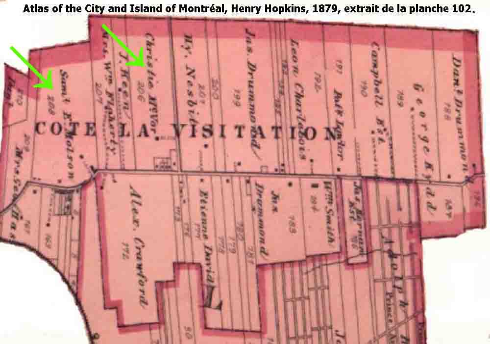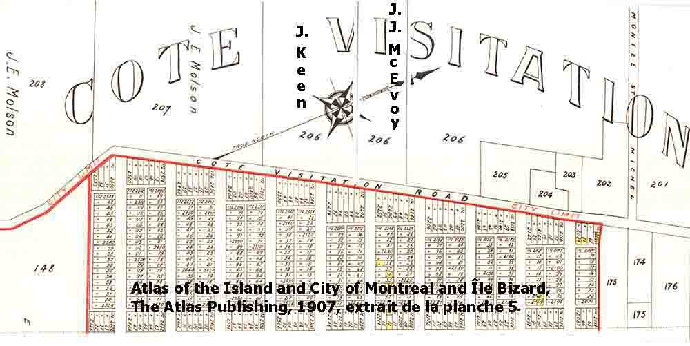 Les atlas historiques de Montréal, dont l’utilité sera mise en relief tout au long de ce blogue et qui sont aussi mis en ligne sur le site de la Grande Bibliothèque, joueront un rôle-clef dans le dévoilement des mécanismes à l’ɶuvre. Ainsi, un premier atlas, celui de 1879, nous permet de visualiser l’organisation de cette municipalité qui sera finalement annexée à Montréal en 1910. Celle-ci est structurée par deux grands axes: dans le sens est-ouest, la Côte de la Visitation qui correspond à une partie du boulevard Rosemont aujourd’hui et, du nord au sud, la Montée Saint-Michel. Une cinquantaine de familles à peine la composent. Un autre atlas, celui de 1907, montre bien l’évolution rapide de la situation. Une première planche, la planche 5, indique notamment que le lotissement de la terre au sud de la Côte de la Visitation est déjà effectué et que les Molson, déjà titulaires de la terre 208, sont maintenant propriétaires de la 207. Peu de temps après l'élaboration de la carte, la célèbre famille acquiert la terre appartenant autrefois à J. Keen -que nous avons grossièrement localisée au haut de la figure suivante-, tandis qu’une autre subdivision de la terre 206 apparaît, propriété de J.J. McEvoy.