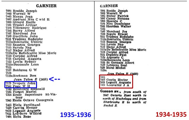 ![]() Supposons que nous cherchons à savoir quand fut érigé le duplex du 7179-7181 de la rue Garnier à Montréal... Si on se fie, à la date de construction proposée par le rôle d'évaluation municipale de la ville de Montréal on cherchera son apparition dans l’annuaire de 1935-1936, sous la rubrique «Annuaire montréalais des rues». La rue Garnier se trouve logiquement dans le groupe des noms de rues commençant par les lettres DEM jusqu’à MOM, lien sur lequel on cliquera pour voir apparaître la page 254 DeLorimier, début de la section que l’on pourra dérouler pour accéder à la page 334 Garnier dont on a reproduit ici un extrait. On remarquera ainsi aisément que la maison du 7179-7181 de la rue Garnier était encore absente en 1934-1935 (rectangle rouge). Il n’y a d’ailleurs encore à cette époque aucune construction sur la rue Garnier immédiatement au nord de Jean-Talon (soit des adresses à proximité du 7150), mais ce n’est plus le cas en 1935-1936 car on note la présence de six nouvelles adresses. En conclusion, on voit bien que l’annuaire municipal de Lovell est une source bien commode pour dater avec précision l’apparition d’une maison. Les lecteurs intéressés par cet outil pourront consulter la section spécifique de notre site qui l’explique plus en détail. |