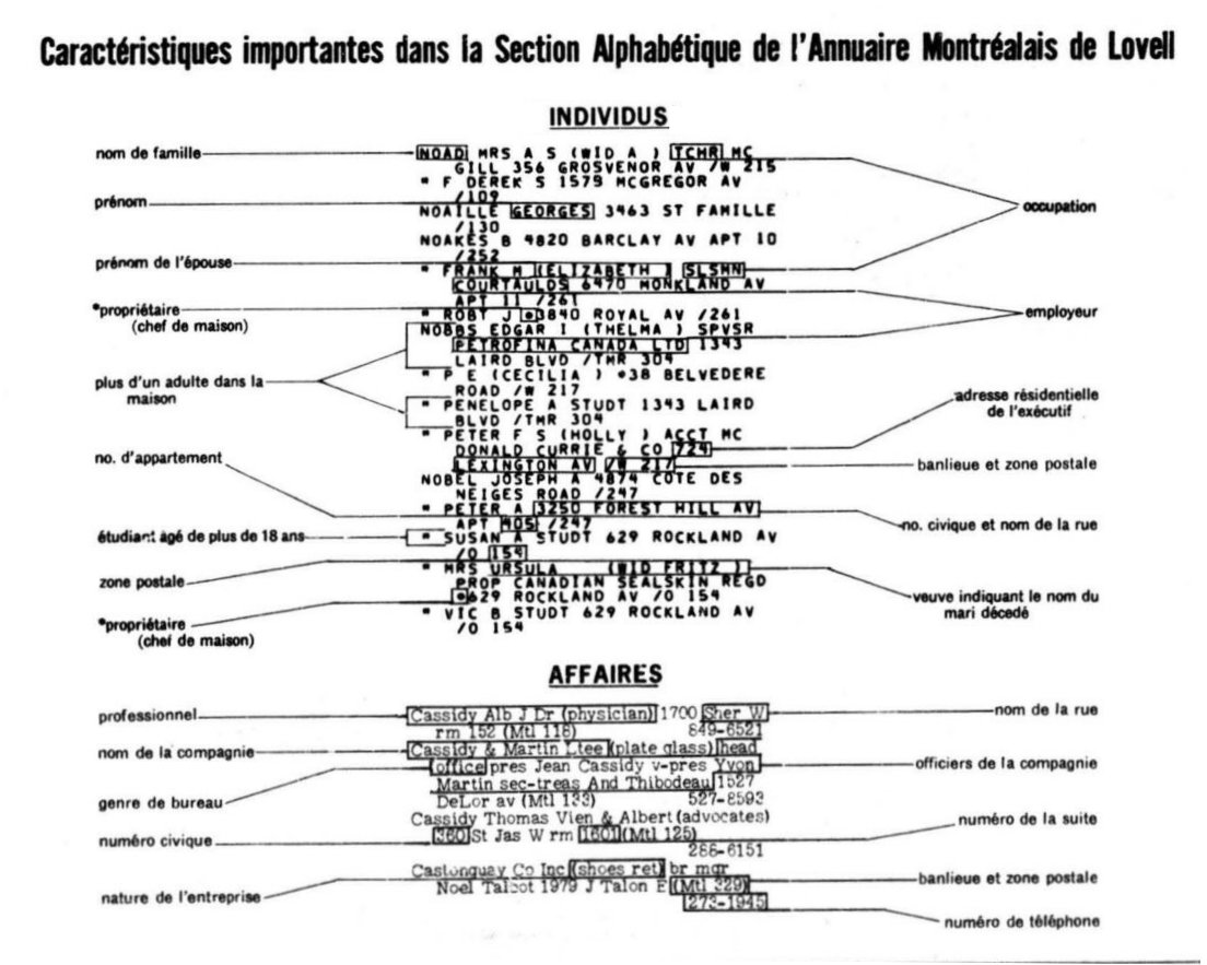 Les résidants sont classés bien évidemment en ordre alphabétique mais l’affichage ne reprend pas le patronyme inutilement. En effet, un seul nom de famille apparaît, pour chacune de ses épellations, au-dessous duquel sont listés les prénoms des individus considérés comme chefs de famille (il arrive que le prénom de leur épouse apparaisse ensuite, entre parenthèses). De plus, les résidantes considérées chefs de famille, qu’elles soient dames ou demoiselles, apparaissent soit à la fin de leur patronyme, soit en suivant simplement l’alphabet, mais toujours en mentionnant d’abord leur titre de civilité anglais (i.e. Miss, Mrs). Dans un autre ordre d’idées, les abréviations des prénoms et des occupations des résidants, de même que celles des rues et places d’affaires, sont normalement listées dans les premières pages des annuaires alphabétiques. En guise d’aide-mémoire, vous pouvez télécharger les pages correspondantes tirées de l’annuaire de 1976 en cliquant sur ce lien. Enfin, pour mesurer l’intérêt des informations susceptibles de se retrouver dans les «Annuaires alphabétiques montréalais», voici comment se présentait l’index de l’année 1973-1974 utilisé lors des dernières années de publication de la Série principale. ![]() -------------------------------------------------- 1 On notera que le tableau indique en couleur les locataires qui sont demeurés plus d’une année au cours de la période étudiée, de même que les deux propriétaires.. 2 Nous n’avons pas inclus ce résidant dans nos hypothèses sur les travailleurs des Ateliers Angus car nous avons la certitude qu’il était employé civique de la Ville de Montréal, information qui ne relève pas des annuaires, on l’aura compris. |