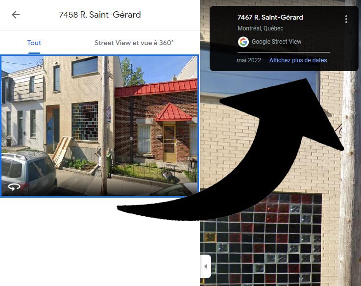 Illustrons la présentation, en repérant à l’aide Google Maps une adresse au hasard, soit le 7458 de la rue Saint-Gérard dans le quartier Villeray à Montréal. Dans le coin supérieur gauche de la carte qui s’affiche à l’écran, on obtient une récente photographie et un rectangle noir qui indique une adresse voisine du secteur recherché (le 7467 R. Saint-Gérard). Dans ce rectangle on trouve indiqué en bleu la mention Affichez plus de dates sur laquelle il suffit de cliquer pour accéder aux différents films captés du quartier par l’outil Street View.