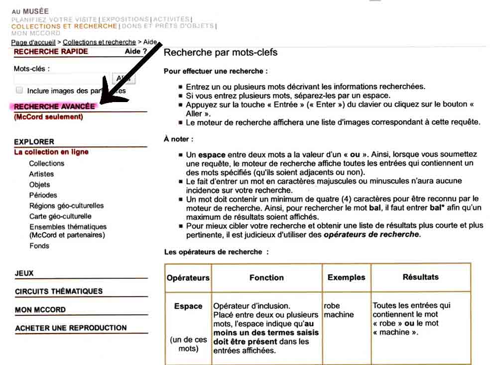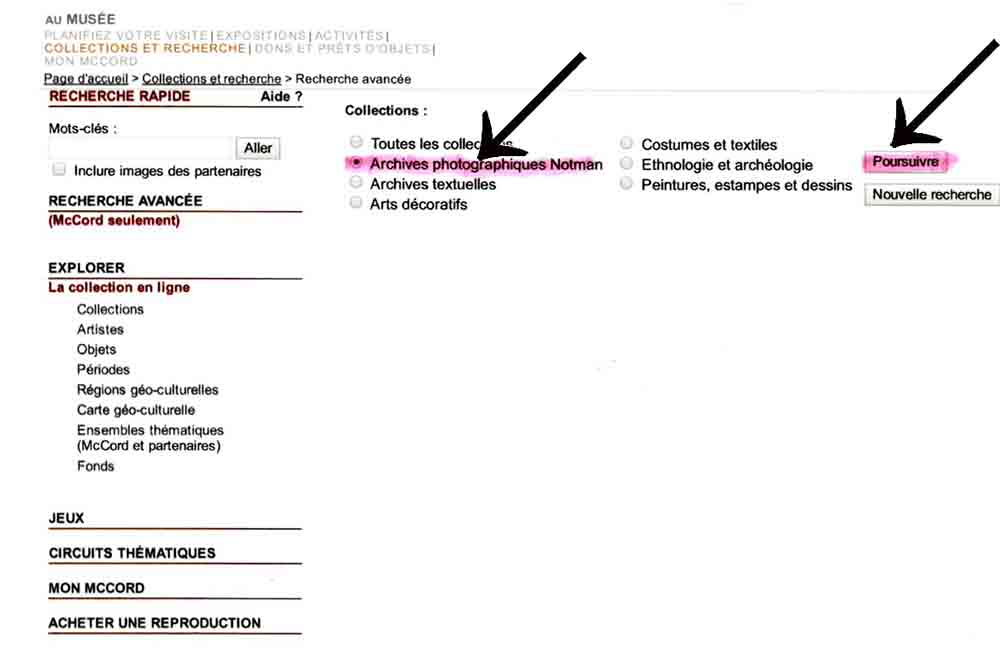 NOTMAN DU MUSEE McCORD Comme première étape, nous vous recommandons fortement d’ouvrir la page du site qui explique la recherche par mots-clefs. Compte tenu que 82 765 photographies d’époque s’y retrouvent, mieux vaut prendre quelques minutes pour bien utiliser l’instrument de recherche.