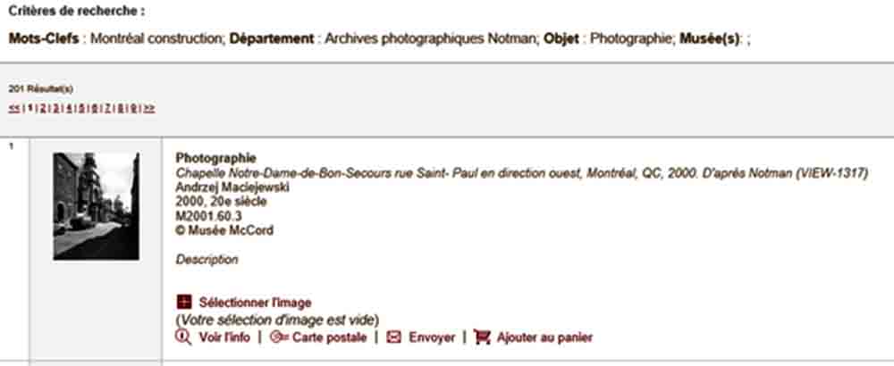 Ensuite, il ne reste plus qu’à POURSUIVRE. À titre indicatif, pour une recherche de photographies en tant qu'OBJET ayant pour thème «Montréal construction». Vous aurez alors accès à 201 photographies bien identifiées que vous pourrez regarder de plus près et télécharger, voire faire imprimer professionnellement, pour peu que vous soyez intéressé à débourser bien entendu!