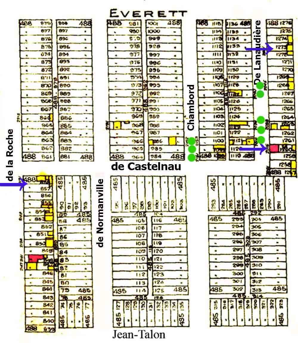 aucune n’était présente au moment de la publication de cet ouvrage. En réalité, trois d’entre elles étaient déjà construites et habitées six ans plus tôt, soit lors de la tenue du recensement de 1901 (voir les flèches bleues). Au recensement suivant, celui de 1911, huit autres ménages s'étaient ajoutés : trois sur la rue Chambord et cinq rue De Lanaudière (les point verts). Reste alors sept autres propriétés apparaissant sur l'atlas de 1914 et qui auraient donc été érigées entre 1911 et 1914.