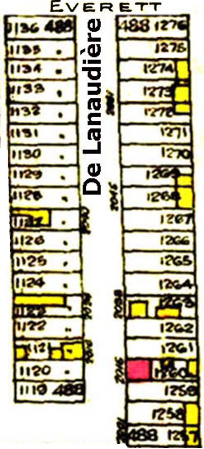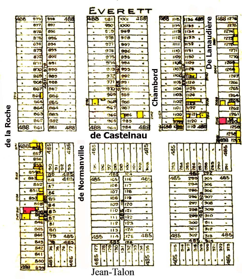 Un agrandissement du secteur de la rue De Lanaudière permet de voir plus clairement la disposition de ces maisons. Certaines occupent plus d’un lot, comme celle sur De Lanaudière près d’Everett qui occupe trois lots, soit les lots 1272, 1273 et 1274. Retenons que le fait qu’on n'y voit qu’une seule adresse pour ces trois lots construits indique clairement qu’il s’agit d’un ensemble formant une seule propriété.